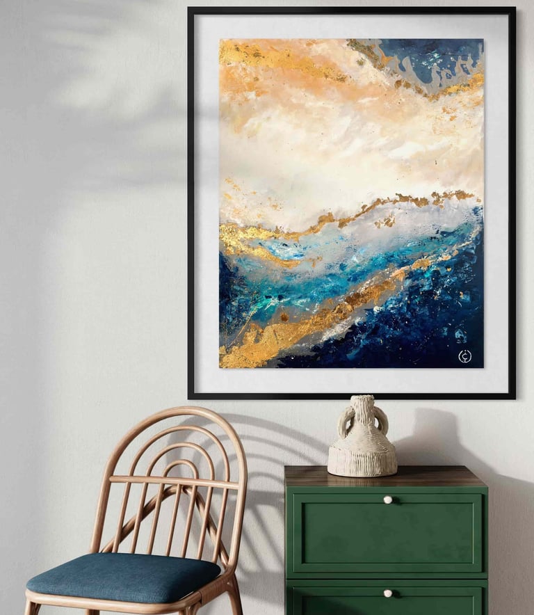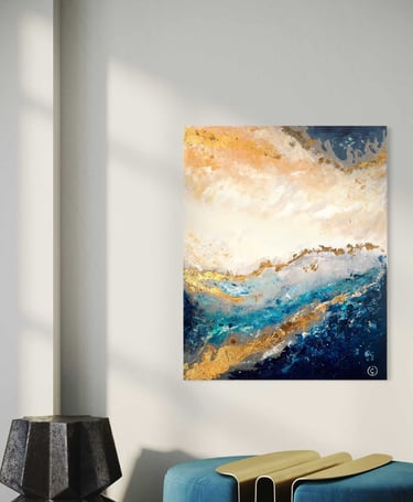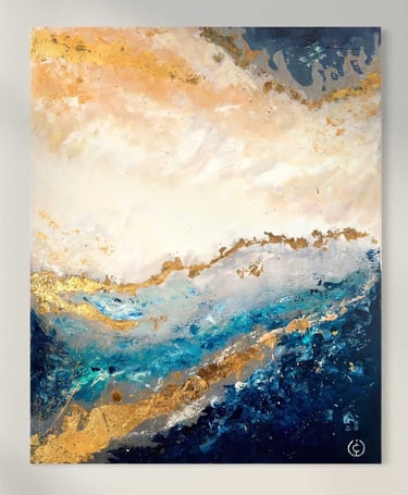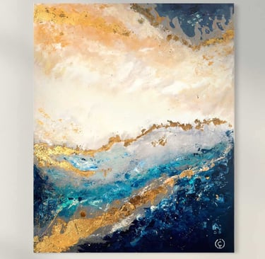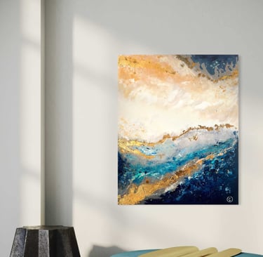 “Whispers of the Horizon” captures the eternal meeting of earth, sky, and sea in a breathtaking dance of light and motion. The golden tones evoke the warmth of dawn breaking over tranquil waves, while deep blues and teals suggest the strength and mystery of the ocean beneath. Subtle strokes of white and textured gold leaf shimmer like sunlight reflecting on water, creating a sense of depth and serenity.